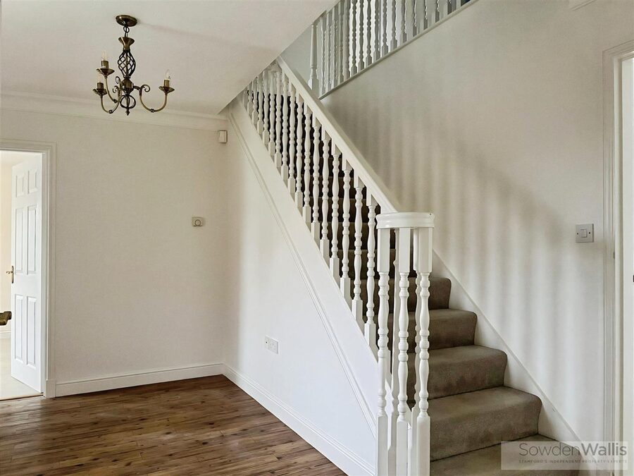 The downstairs layout incorporates a generous family kitchen/diner, a large dual aspect living room, two further reception rooms, a utility room and two downstairs toilets. Upstairs, a large principle bedroom offers ample space and storage, with a four piece ensuite bathroom with walk in shower. Three further double bedrooms, one with ensuite shower and a family bathroom complete the upstairs layout. The house also benefits from a double garage and driveway parking. This property offers an ideal balance of village community, green spaces, and easy access to the amenities and transport options of Stamford.